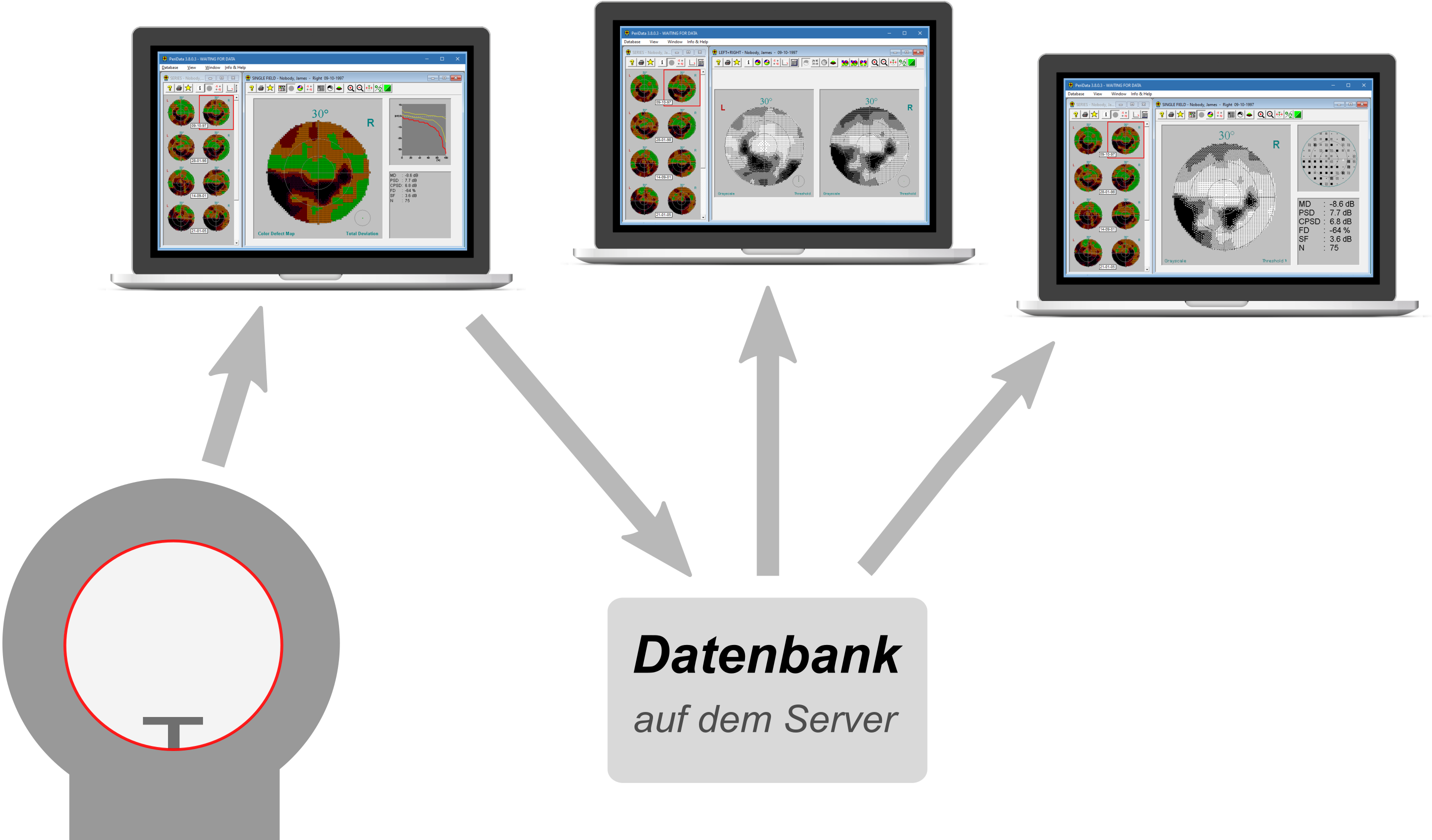 empfängt, im Praxis-Netz speichert und die Gesichtsfelder an jedem Computer in der Praxis anzeigt.