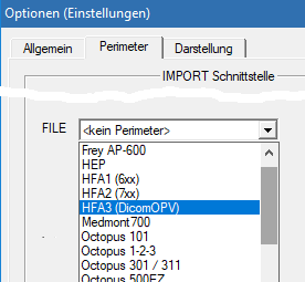 Die Verbindung wird NUR AN EINEM ARBEITSPLATZ (meistens im Perimeterraum) konfiguriert. Dort wird im Menü Extras > Optionen > Perimeter > Import-Schnittstelle der Geräte-Typ eingestellt. Alle anderen Arbeitsplätze haben KEINE Perimeter-Verbindung, sondern lesen die gespeicherten Daten aus der zentralen Datenbank (Viewing-Modus). Diese PCs müssen deshalb bei einem Gerätewechsel nicht neu konfiguriert werden.